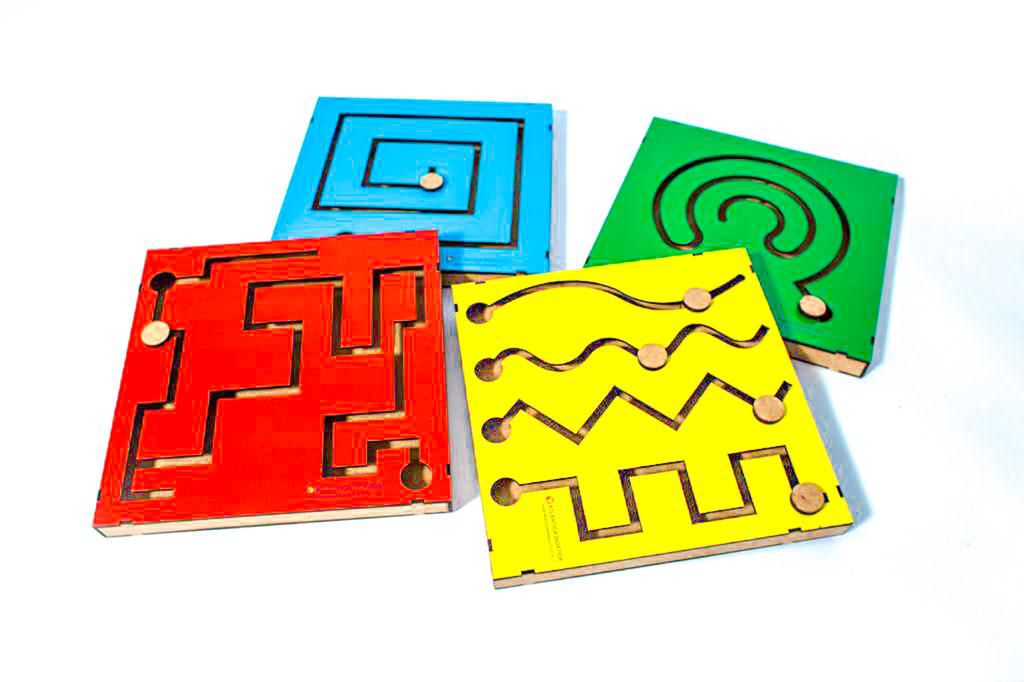 Confeccionados em M.D.F. composto por 4 pinos e 4 painéis vazados em forma de cursos (curvilíneo; fantástico; pré escrita e linear), pintados nas cores vermelho, verde, amarelo e azul, com tinta ultravioleta atóxica. Este é o brinquedo ideal para ajudar as Crianças em suas primeiras descobertas e desenvolvimento criativo.